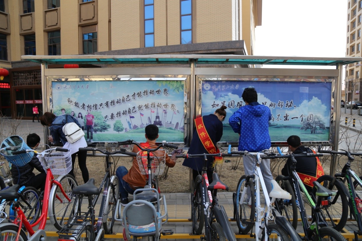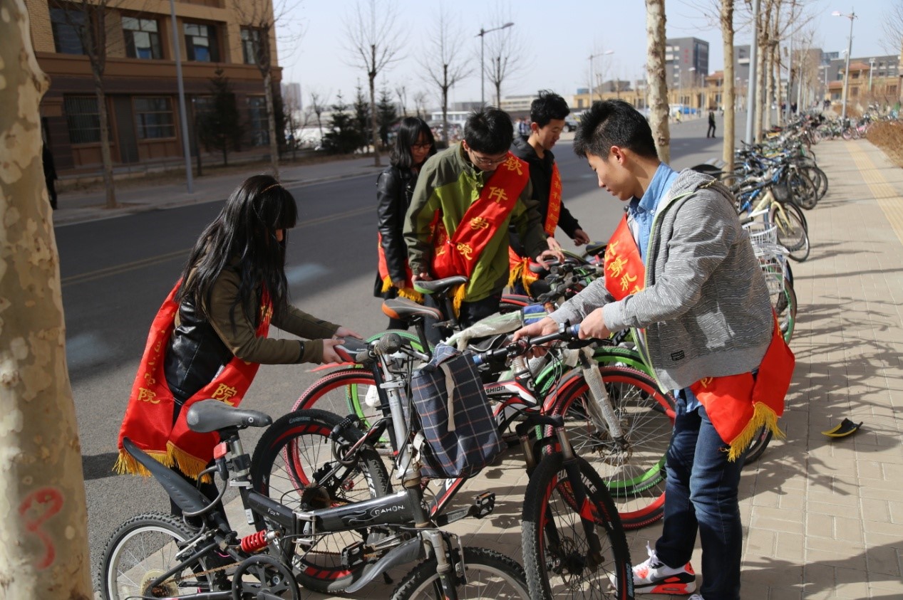 在雷锋日张贴学习雷锋精神的条幅,鼓励大家践行雷锋精神,定期组织人员进行各宿舍楼、教学楼、食堂门口的自行车整齐摆放,加深学生对雷锋精神的认识和理解,促使学生自觉主动地在学习生活中时刻关注雷锋精神。红旗志愿者中心将参与成员分为东西区两组,分别负责擦洗东西区食堂附近带玻璃的宣传橱窗。活动前期每人提前准备干湿布各一块,统一时间在指定地点集合并开展本次活动 。