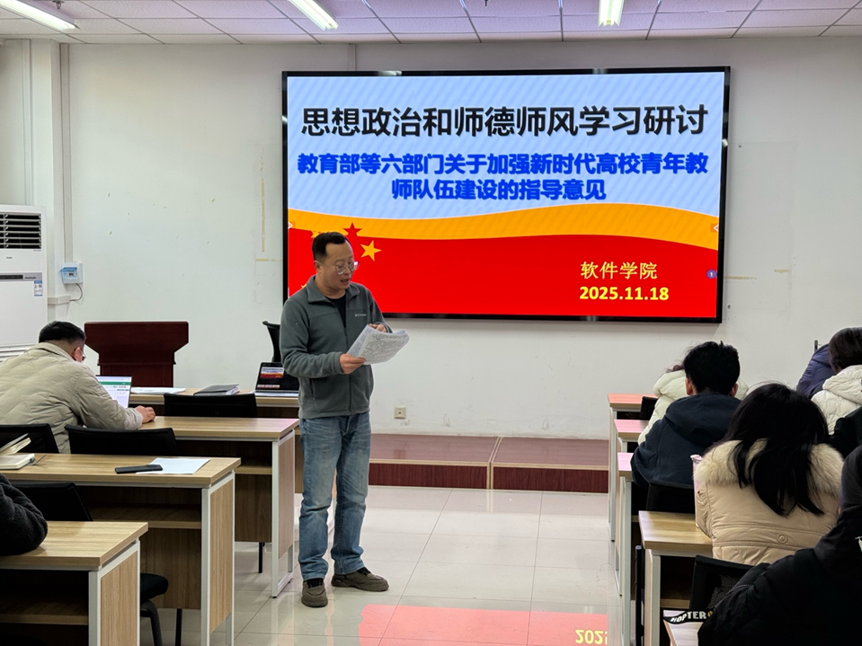 2025年11月18日下午,软件工程系全体教师在学院209会议室召开了师德师风学习会。会议由系副主任阎鹏飞主持。会议重点围绕教育部等六部门印发的《关于加强新时代高校青年教师队伍建设的指导意见》展开专题学习,深入探讨师德师风建设内涵与实践路径。