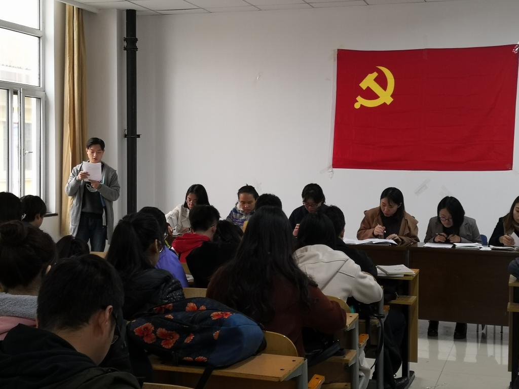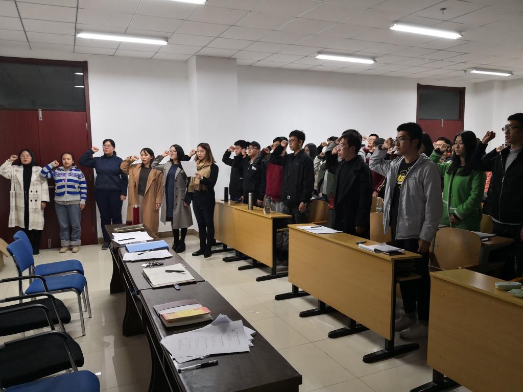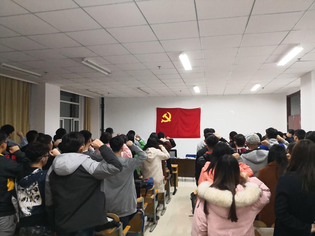 随后,全体党员同志面对党旗庄严宣誓,重温入党誓词,使灵魂又一次经受党的洗礼。最后,两位支部书记也分别进行了总结,向所有党员提出要求,强调要加强政治意识,加强政治理论学习以及综合素质的提升,严守党的纪律,时刻提高自己的党性修养,为成为一个正式党员而不懈努力,为党组织做出贡献。