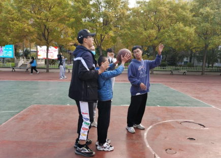 志愿者帮助盲童练习投篮