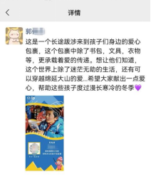 包裹虽小,但爱心无限。爱心包裹活动结束后,志愿者们在各个社交平台分享自己的收获与成果,以及自己参加活动的心得体会。虽然活动结束,但同学们对公益的热忱以及对山区儿童的关爱丝毫不减。小包裹涵盖大爱心,温暖孩子们的冬天,每一个包裹里都承载着众位善行英雄的爱心以及对孩子们的关心,蕴含着对孩子们的美好祝愿以及殷切期许。