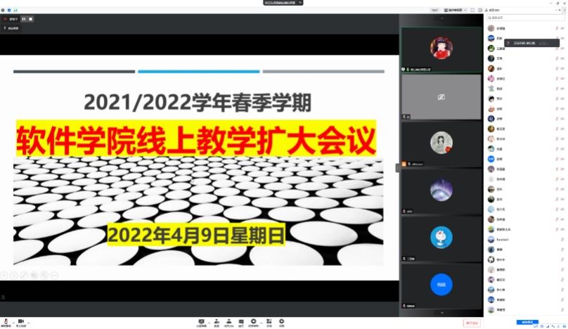 为进一步落实学校“防控不放松,学生不停学,教师不停教,质量有保障”的要求,保障永利集团3044官网欢迎您教学工作各方面有序推进,4月9日下午,学院召开了2021/2022年春季学期教学线上扩大会议,对学院教学工作进行了详细部署。本次会议由软件工程系主任谢红薇主持,校院督导组老师、院系部相关负责人、学工负责人、授课教师、实验室管理人员及研究生助教等70余名师生参加。