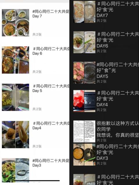 “一粥一饭当思来处不易,半丝半缕恒念物力维艰。”知粮在心,而惜粮在行,为了真正落实“珍惜粮食,杜绝浪费”的理念,本次活动的第二阶段设立了光盘打卡活动。参与者需完成当日任意一餐餐前、餐后不重复“光盘”照片的打卡,附带话题“同心同行二十大,共促惜粮好‘食’光”,发送在至朋友圈即视为打卡成功。通过为期一周的打卡活动,充分体现了同学们对落实“珍惜粮食,杜绝浪费”的理念的积极性。线上打卡人数为919人,其中868名同学打卡7次,占参与人数的88.7%,共计6333人次。参与活动的每一位同学都将“知粮在心,惜粮在行”的口号落到了实处,用实际行动展现了节约风范。