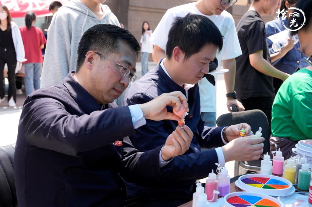 “流沙心愿瓶”,同学们写下自己的心愿,放入心愿瓶中,用五颜六色的流沙填满瓶身,学工部部长赵国俊、校团委书记史薛伟也认真的参与其中,绘出一幅美丽的流沙画,用实际行动激励同学们向着心愿前行,永不忘记给自己的未来一份希望。