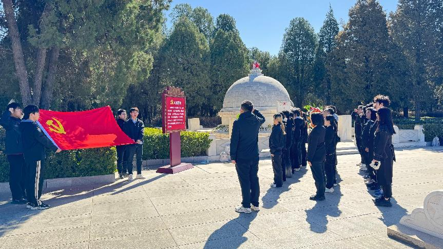 上午9时,全体师生党员统一着黑色正装、佩戴党徽,在明向校区南门整队出发。抵达双塔烈士陵园后,在庄严肃穆的氛围中,拉开序幕有序开展祭扫活动。在高君宇烈士雕像前,伴随着讲解员对这位山西党团组织创始人革命事迹的深情讲述,师生们仿佛回到了那个热血沸腾的年代。党员代表缓步上前敬献鲜花,全体人员面向烈士雕像行三鞠躬礼,表达深切缅怀之情。