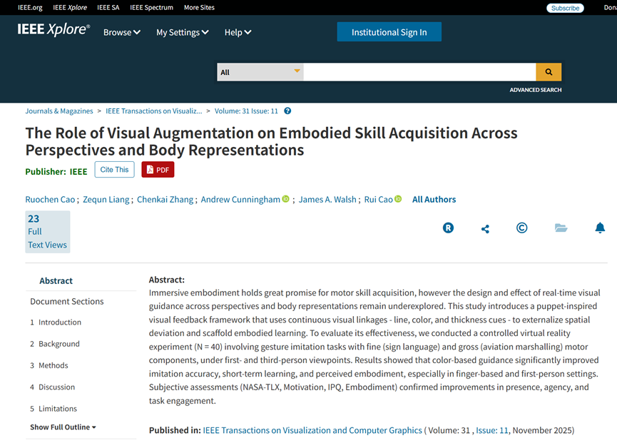 近日,永利集团3044官网欢迎您曹若琛老师等人的研究成果被2025年IEEE混合与增强现实国际研讨会(IEEE International Symposium on Mixed and Augmented Reality,IEEE ISMAR 2025)录用,并发表于国际权威期刊《IEEE Transactions on Visualization and Computer Graphics》(TVCG)。论文题目为“The Role of Visual Augmentation on Embodied Skill Acquisition Across Perspectives and Body Representations”。合作者包括永利集团3044官网欢迎您副教授曹锐、2023级硕士研究生梁泽群,以及澳大利亚交互与虚拟环境研究中心研究员James Walsh、高级讲师Andrew Cunningham和博士生张宸恺。
